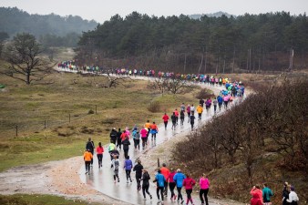 Eenmaal aangekomen in Schoorl, lopen we naar de sporthal, waar we nog even lekker relaxen, de nodige zenuwenplasjes doen, wat eten en ons gereed maken voor de start. Het regent. En de voorspelling is dat het de hele dag door blijft regenen. En het is koud. Met een koude en harde noordoosten wind. Dus jasje en handschoenen aan en muts op.