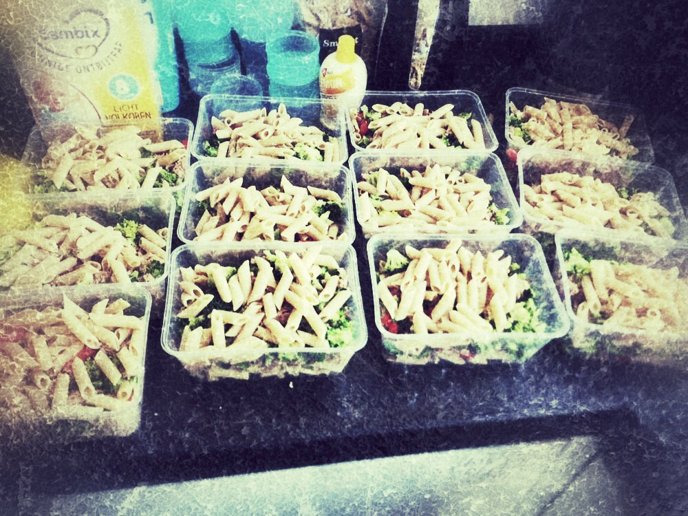 Eenmaal aangekomen in Schoorl, lopen we naar de sporthal, waar we nog even lekker relaxen, de nodige zenuwenplasjes doen, wat eten en ons gereed maken voor de start. Het regent. En de voorspelling is dat het de hele dag door blijft regenen. En het is koud. Met een koude en harde noordoosten wind. Dus jasje en handschoenen aan en muts op.