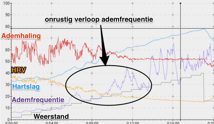 Nico laat mij de complete grafiek zien van hartslag, ademhalingen (diepte en ritme), wattage weerstand, en hartslag variabiliteit.
